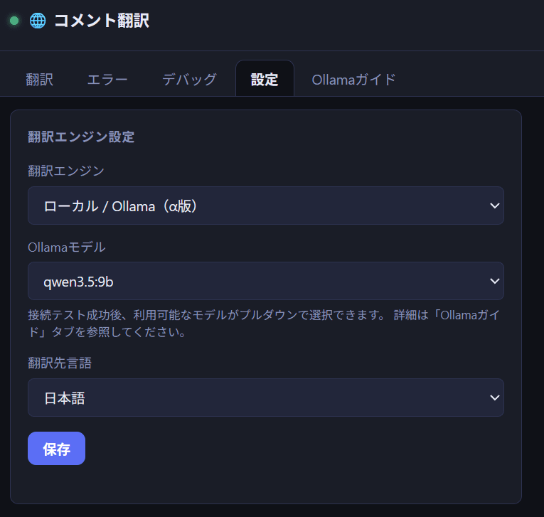 初めましてくあです。 私は趣味でよく配信を見ているのですが、よく配信者さんが「この外国語のコメント読めない...」と悩んでいることを目撃しました。 そこで現在配信の分野で広く普及されているわんコメに着目し、翻訳プラグインを作成しました。 本プロダクトのイチオシポイントは単にDeepL APIのみで完結するのではなくollamaでのローカルAIも選択することができるということです! 配信者さまはもちろん、推しの配信者がいる方もぜひぜひ活用・共有していただければと思います!